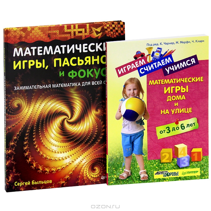 В комплект вошли 2 книги: "Играем, считаем, учимся. Математические игры дома и на улице. От 3 до 6 лет" и "Математические игры, пасьянсы и фокусы. Занимательная математика для всей семьи".