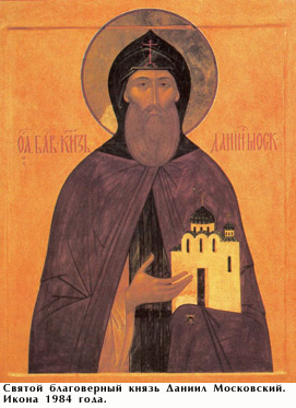 Даниил Александрович Московский (1261 - 1303 гг.) - великий князь московский, младший сын Александра Ярославича Невского. Получил в удел Москву с округой. Был активным участником борьбы своих старших братьев Дмитрия Переяславского и Андрея Городецкого за великое Владимирское княжение и за Новгород. В 80-х гг. ХIII в. уже играл крупную политическую роль в Северо - Восточной Руси. При нем Москва стала самостоятельным княжеством. Положил начало московской княжеской династии. Основал Даниловский монастырь. В конце жизни принял монашество и был упокоен в Даниловском монастыре. Канонизирован Русской Православной церковью.