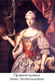 Анна Леопольдовна (Елизавета Екатерина Христина) (1718 г., г. Росток - 1746 г., г. Холмогоры) - правительница Российской империи при малолетнем сыне Иване VI Антоновиче с 9.11.1740 г. - по 25.11.1741 г. Дочь герцога Мекленбург - Шверинского Карла Леопольда и Екатерины, дочери царя Ивана V. С 1722 г. жила в России. С 1730 г. воспитывалась при дворе своей тетки Анны Иоанновны (тоже дочери Ивана V). В 1733 г. приняла православие. В 1739 г. выдана замуж за принца Брауншвейг - Беверн - Люненбургского Антона Ульриха. В 1740 г. родила сына Ивана, которого бездетная Анна Иоанновна пожаловала титул великого князя и объявила наследником престола, а регентом при нем назначила Э.И. Бирона. После смерти Анны Иоанновны и ареста Бирона при содействии Х.А. Миниха стала правительницей с титулами великой княгини и императорского высочества. В 1741 г. отменила смертный приговор Э.И. Бирону. Управлением государства практически не занималась. Фактическая власть принадлежала Кабинету министров. Отличалась беспечностью, ленью, доверчивостью. Подписала манифест об отставке Х.А. Миниха. В 1741 г. в результате заговора была отстранена от власти дочерью Петра I Елизаветой Петровной. Жила под арестом вместе с семьей в Риге (1741 - 1742 гг.), Раненбурге (Ораниенбург) Воронежской губернии (1744 г.), Холмогорах (с 1744 г.). В 1747 г. во время родов умерла, оставив 4 детей, судьба которых была не менее трагичной.