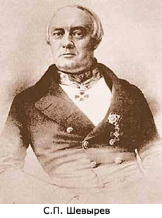 Шевырев Степан Петрович (1806-1864 гг.) - русский критик, историк литературы, поэт, академик Петербургской академии наук (1847 г.), писал работы по истории и теории русской поэзии. Вместе с М.П. Погодиным возглавил журнал "Москвитянин", в котором развивал теорию "официальной народности".