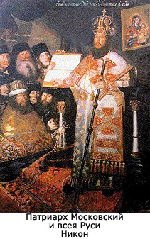 Никон (1605 - 1682 гг.) - шестой патриарх Московский и всея Руси. Родился в 1605 г. в семье крестьянина села Вельдеманова Княгининского уезда, Нижегородской губернии. В миру его звали Никита Минов. В раннем возрасте Никон много терпел от злой мачехи. Научившись грамоте, мальчик тайно ушел в Макарьев - Желтоводский монастырь, где усердно изучал книжную премудрость. Отец, узнав место его пребывания, хитростью вызвал его из монастыря. После смерти отца Никон женился, принял священство и получил приход в Москве. Смерть, в малолетстве, всех трех детей Никона сильно потрясла его и была принята им за указание свыше. Он уговорил свою жену постричься, а сам ушел на Белое море, где, 30 лет от роду, принял монашество в Анзерском ските под именем Никон. В 1646 г. Никон отправился в Москву и, согласно обычаю, явился с поклоном к молодому царю Алексею Михайловичу. Понравившись царю, он был оставлен в Москве и посвящен в архимандриты Новоспасского монастыря, где была родовая усыпальница Романовых. Царь часто ездил туда молиться за упокой своих предков и еще больше сблизился с Никоном, которому приказал ездить к нему во дворец на беседы каждую пятницу. Пользуясь расположением царя, Никон стал просить его за утесненных и обиженных. Это было по нраву царю. Вскоре Никон занял исключительное положение в Москве и приобрел всеобщую любовь. В 1648 г. он был возведен в сан митрополита новгородского. Но Никон не пользовался в Новгороде любовью, вследствие чрезмерной строгости и взыскательности к подначальным духовным людям; да и миряне не питали к нему расположения за крутой нрав властолюбивый нрав. После смерти патриарха Иосифа Никон, согласно царскому желанию, избран был в патриархи (1652 г.). Никон стал отказываться; тогда царь, окруженный боярами и народом, в Успенском соборе поклонился Никону в ноги и со слезами умолял его принять патриарший сан, на что Никон согласился под условием, что все будут почитать его как архипастыря и отца верховнейшего и дадут ему устроить церковь. Царь, а за ним власти духовные и бояре, поклялись в этом. Шестилетнее управление Никоном русской церковью ознаменовалось возникновением раскола, непосредственной причиной которого считается предпринятое Никоном исправление церковных книг. Убежденный в православии греков, Никон испытал наиболее сильное влияние со стороны пришлых в Москву греческих иерархов. Он перенес в Россию греческие амвоны, греческий архиерейский посох, греческие клобуки и мантии, греческие церковные напевы, принимал греческих живописцев и мастеров серебряного дела, строил монастыри по образцу греческих, словом, всюду выдвигал греческий авторитет, отдавая ему преимущество перед вековою русскою стариною. В 1654 г. Никон собрал собор, которым было постановлено править богослужебные книги по древним греческим и славянским рукописям. Приговор собора не подписали епископ коломенский Павел и несколько архимандритов и протопопов. К ним присоединились Неронов, Аввакум и др., восстававшие против передачи дела и исправления книг в руки киевлян и греков, православие которых, по общераспространенному в Москве мнению, считалось сомнительным. В 1656 г. Никон снова собрал собор, на который были приглашены бывшие тогда в Москве Антиохийский патриарх Макарий и митрополиты сербский, никейский и молдавский. Собор этот одобрил исправлен