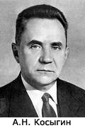 Косыгин Алексей Николаевич (1904-1980 гг.) - председатель Совета Министров СССР (1964-1980 гг.), дважды Герой Социалистического Труда (1964, 1974 гг.). В 1939-1940 гг. - нарком текстильной промышленности СССР. В 1940-1953, 1953-1956, 1957-1960 гг. - заместитель председателя СНК - Совета Министров, одновременно в 1941-1942 гг. заместитель председателя Совета по эвакуации. В 1943-1946 гг. председатель СНК РСФСР. В 1948-1952 гг. и 1960-1980 гг. член Политбюро ЦК КПСС. В 1948-1954 гг. министр финансов, легкой промышленности и др. В 1959-1960 гг. председатель Госплана СССР. Инициатор экономической реформы 1965 г., направленной на развитие самостоятельности предприятий.