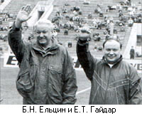 Гайдар Егор Тимурович - российский государственный и политический деятель, экономист. Родился в 1956 г. в Москве, внук известных писателей А.П. Гайдара и П.П. Бажова. Окончил экономический факультет МГУ, доктор экономических наук. С 1980 г. работал во Всесоюзном НИИ системных исследований; ведущий научный сотрудник Института экономики и прогнозирования научно-технического прогресса АН СССР (1985-1987 гг.); редактор отдела журнала "Коммунист" , затем газеты "Правда" (1987-1990 гг.) С 1990 г. директор Института экономической политики Академии народного хозяйства и АН СССР. С ноября 1991 г. заместитель, с 1992 г. 1-й заместитель, в июне - декабре 1992 г. и.о. председателя правительства РФ. Начал осуществление курса на рыночное реформирование российской экономики. С декабря 1992 г. директор Института экономических проблем переходного периода. В сентябре 1993-январе 1994 г. 1-й заместитель председателя правительства РФ, министр экономики. В декабре 1993-декабре 1995 г. лидер фракции "Выбор России" в Государственной думе. С июня 1994 г. председатель партии "Демократический выбор России".